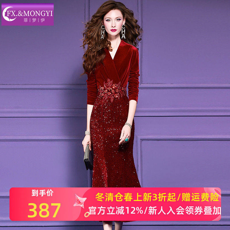 菲梦伊亮片金丝绒连衣裙女秋季轻熟高级感气质女神范鱼尾裙子礼服