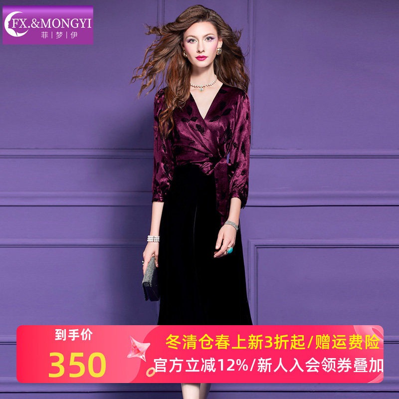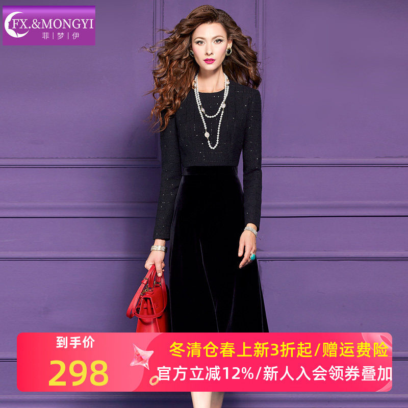 菲梦伊提花金丝绒连衣裙女秋季阔太太高贵优雅收腰气质假两件裙子