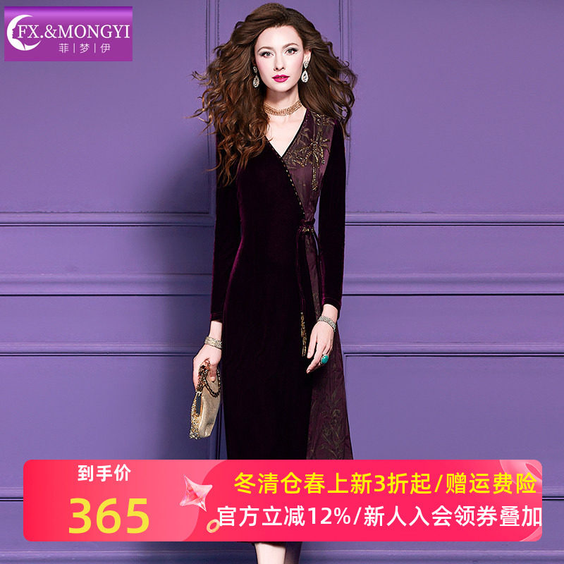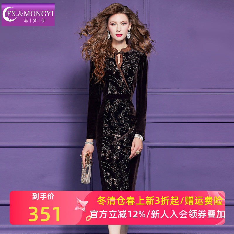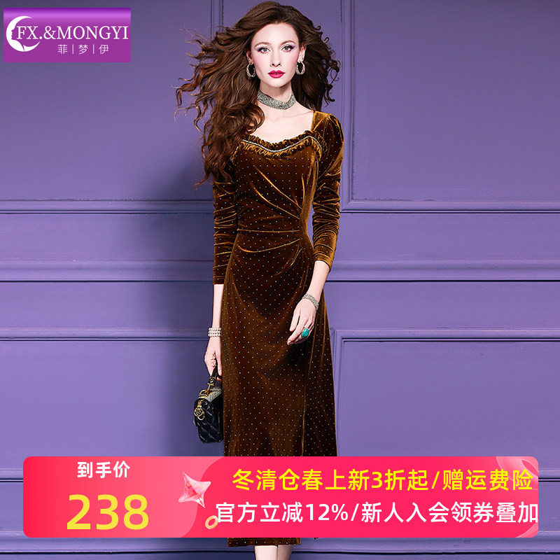 菲梦伊原创钉珠镶钻金丝绒连衣裙女秋装轻熟高级收腰性感礼服长裙
