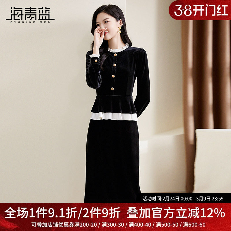 海青蓝赫本风黑色金丝绒连衣裙女秋冬新款法式洋气减龄假两件裙子
