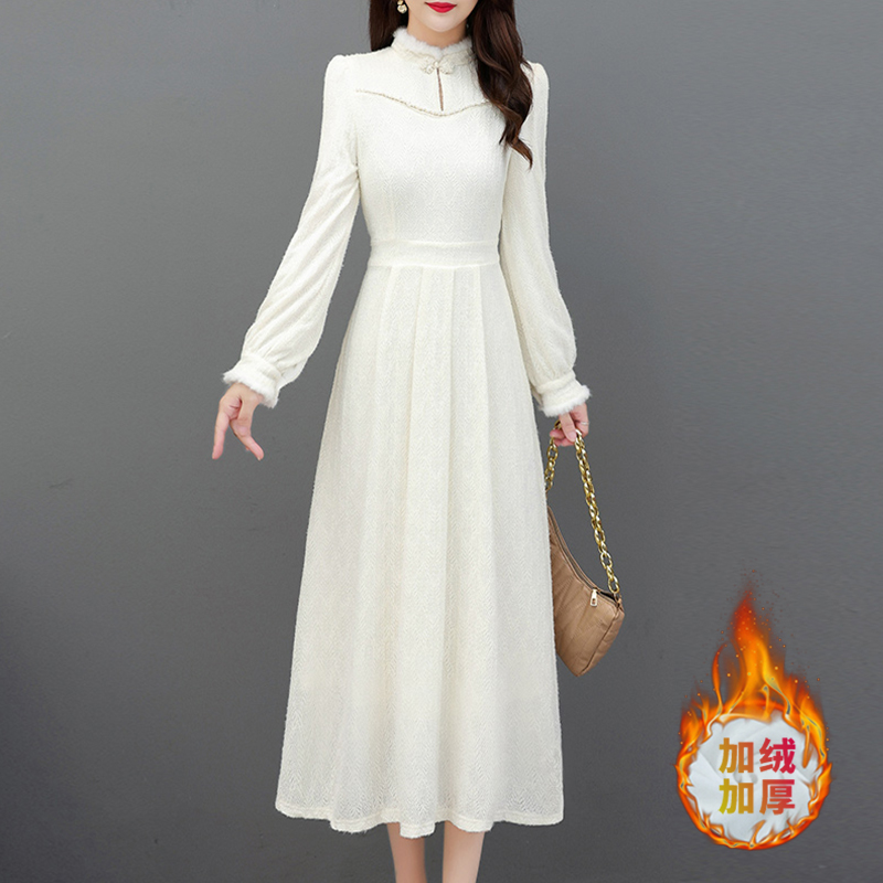 新中式白色蕾丝连衣裙立领国风盘扣改良旗袍长裙加绒加厚打底裙子