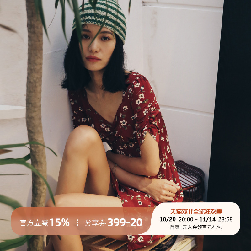 sincethen金智秀jisoo同款 复古碎花V领沙滩裙海边度假连衣裙短裙
