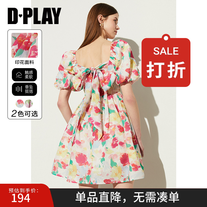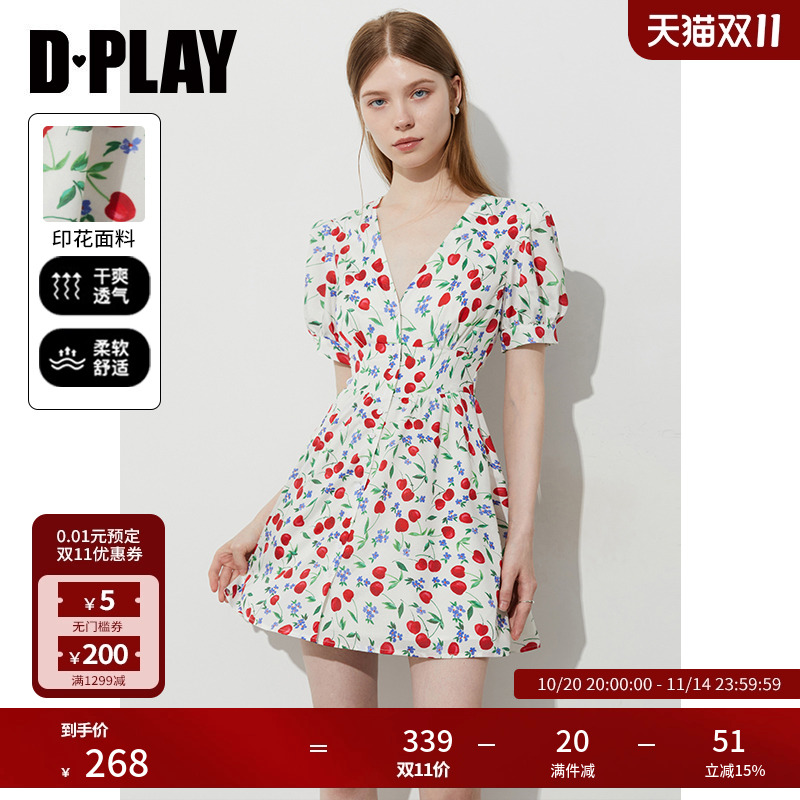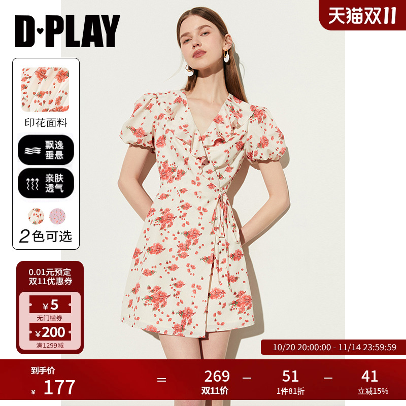 DPLAY年夏优雅V领荷叶边泡泡袖粉色连衣裙女印花短裙沙滩裙