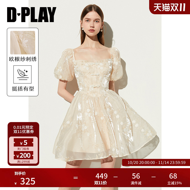 DPLAY2025夏季新中式国风白色连衣裙方领蓬蓬裙法式短裙沙滩裙