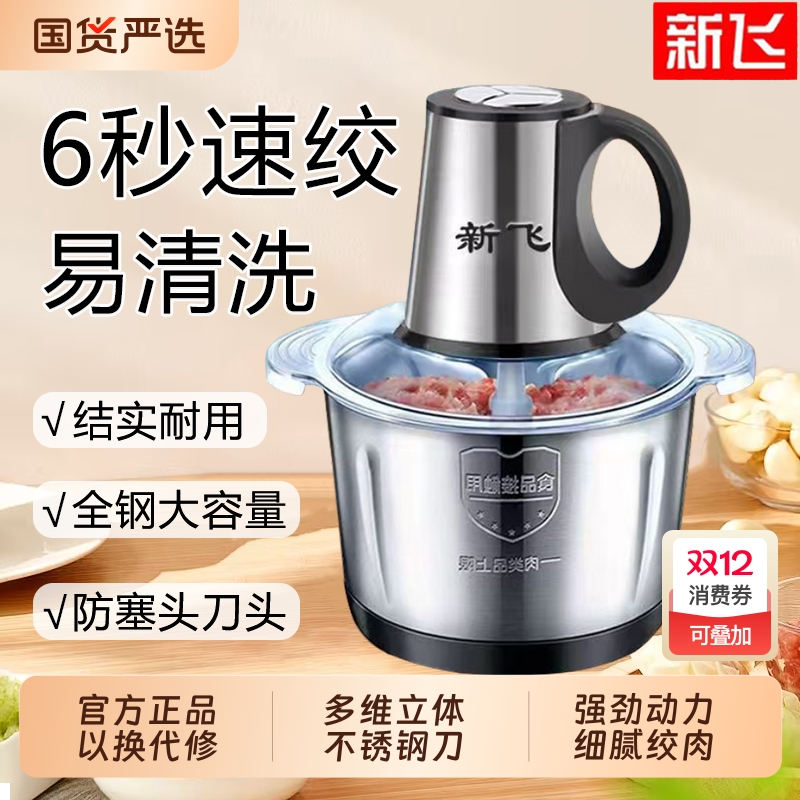新飞家用绞肉机电动小型多功能大功率打蒜和面料理机大容量不锈钢
