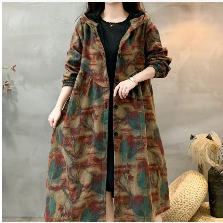 2025新款民族风中长款风衣外套女春秋装宽松大码连帽棉衣棉服上衣