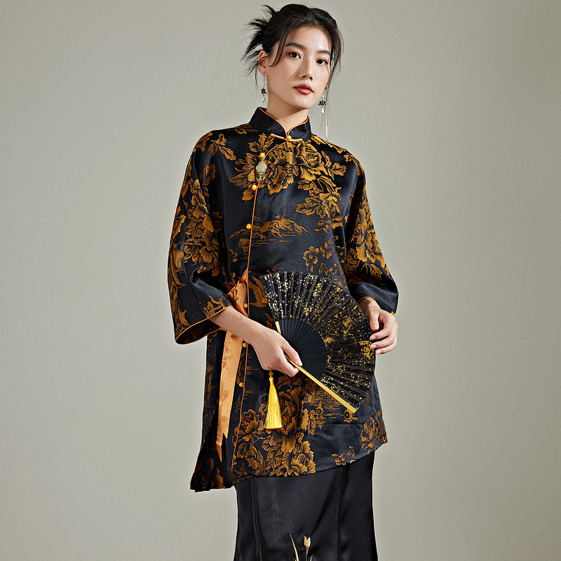 陌遇原创2025春夏新款民族风改良提花缎中长款太太服中式唐装上衣