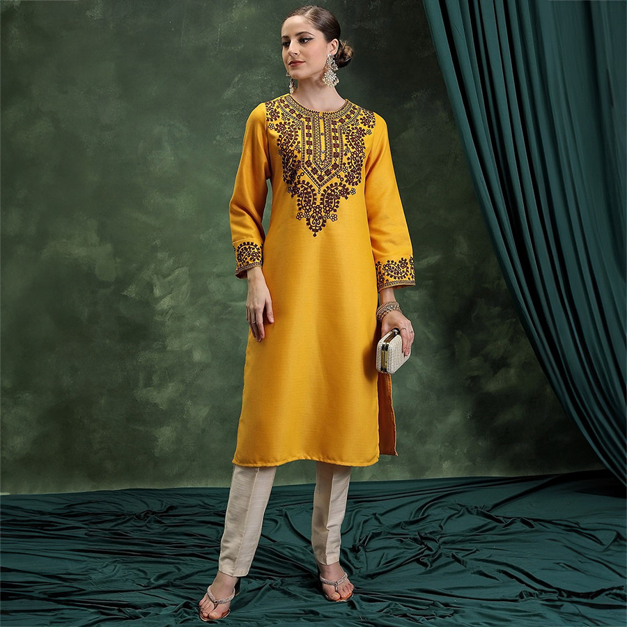 印度进口民族风女装日常刺绣上衣中长款黄色七分袖圆领厚款秋磨毛