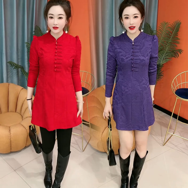 2023年冬季新款衬衫裙复古盘扣民族风中长款女新中式旗袍丝绒上衣
