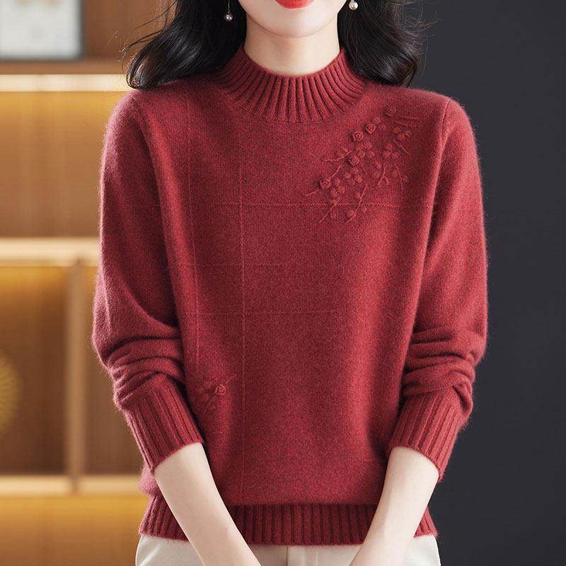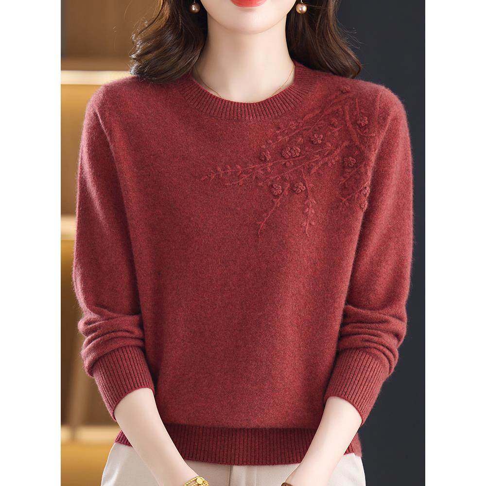 100%山羊绒纯色中年妈妈提花毛衣女秋冬圆领大码针织打底衫女上衣