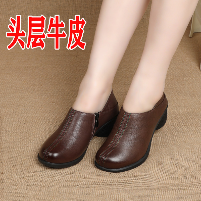 春秋女士真皮妈妈鞋坡跟中跟中年女鞋防滑浅口单鞋牛皮中老年皮鞋