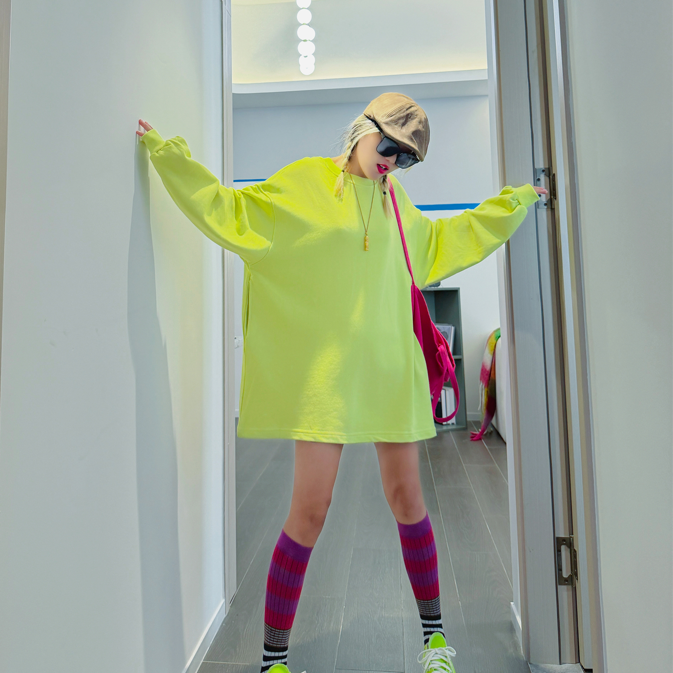 秋冬加厚宽松长袖T恤果绿色中长款纯棉卫衣女韩版休闲纯色打底衫