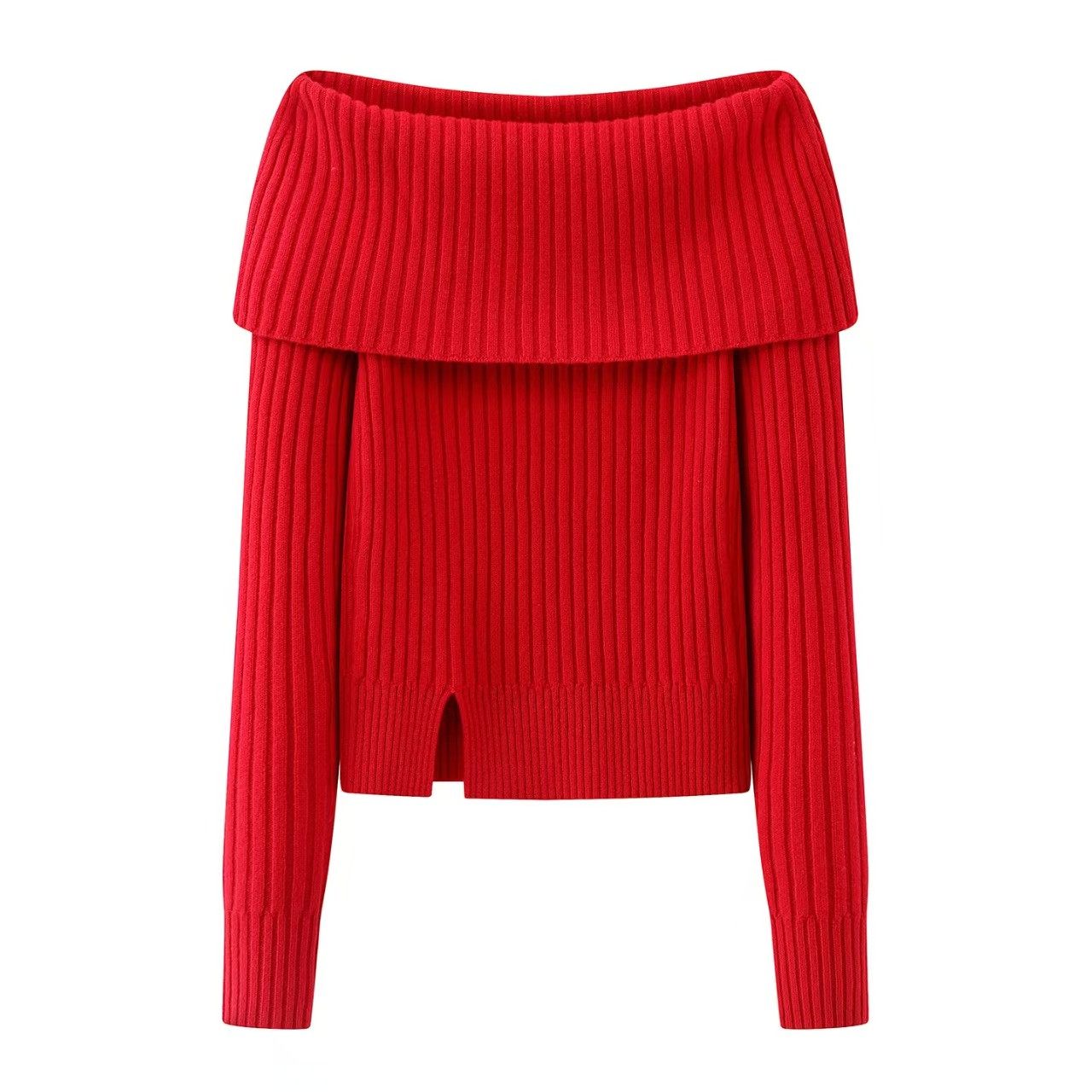 小艾!红色一字肩翻领针织衫女2025秋冬下摆开叉毛衣法式复古上衣