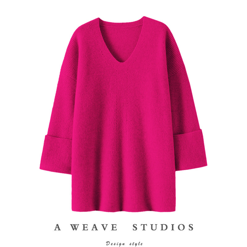 舒适自在!莫兰迪粉下摆开叉V领100%纯山羊绒衫女纯羊绒毛衣宽松
