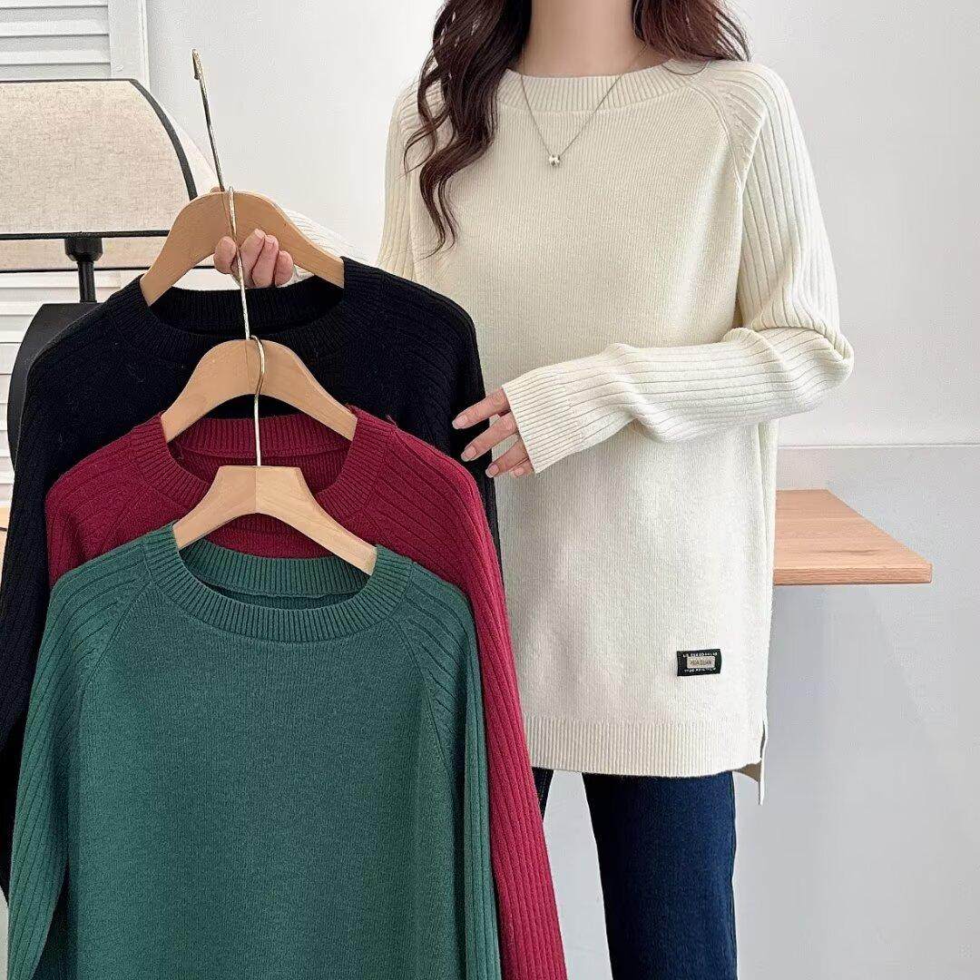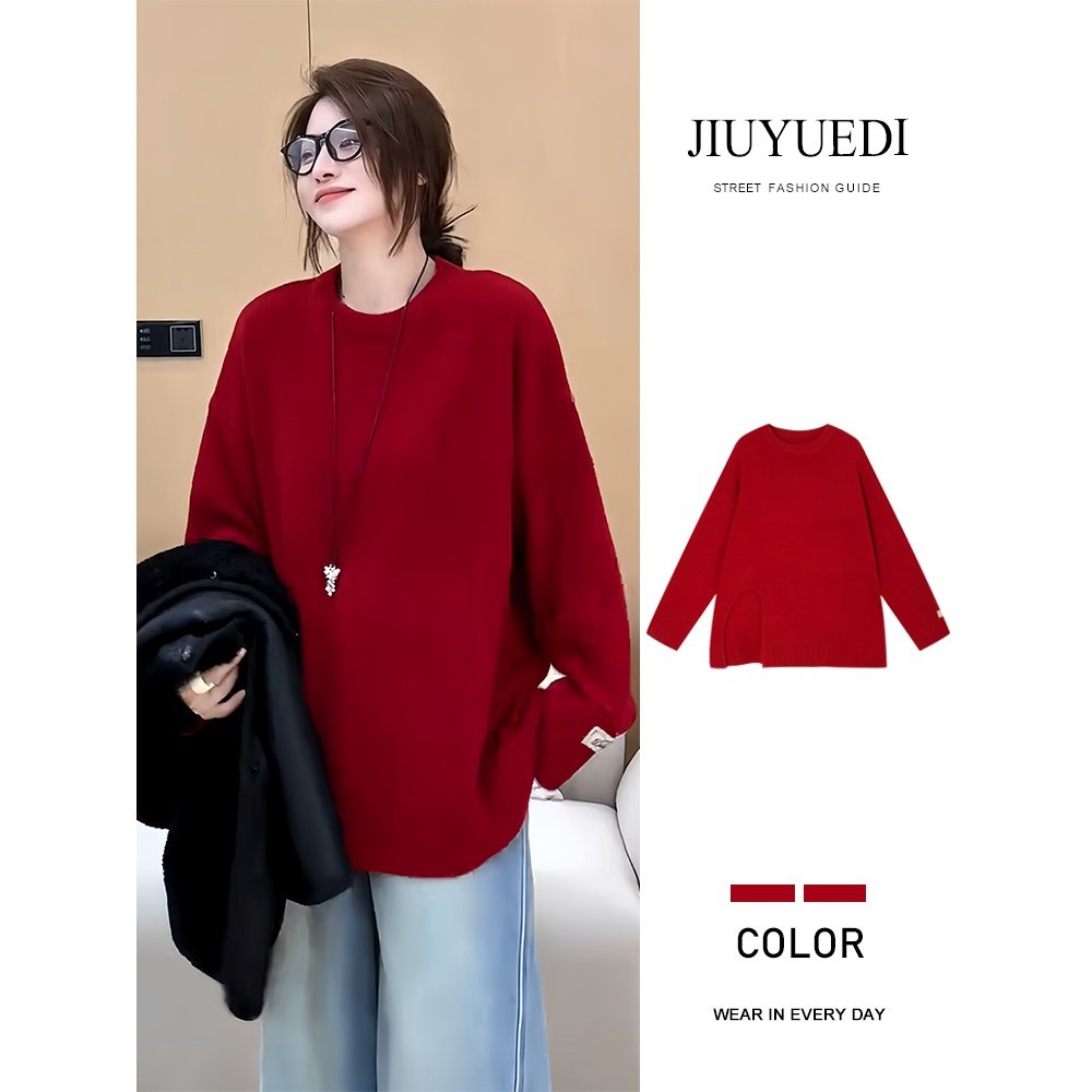 JIUYUEDI九月底韩系红圆领长袖开叉下摆毛衣女秋冬通勤套头上衣