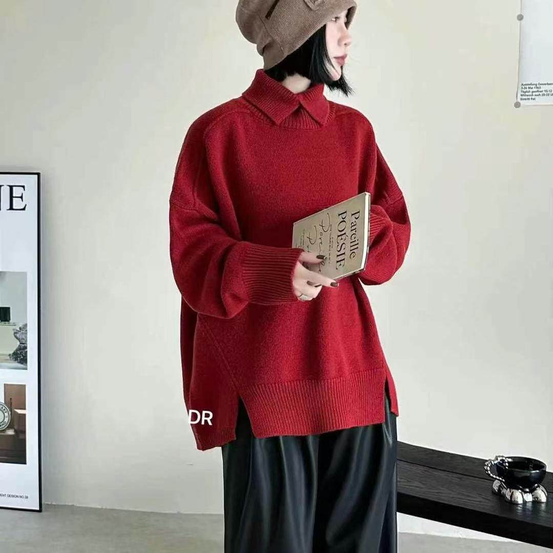 秋冬新款半高领毛衣下摆开叉设计高级感欧洲站宽松气质针织毛衣女