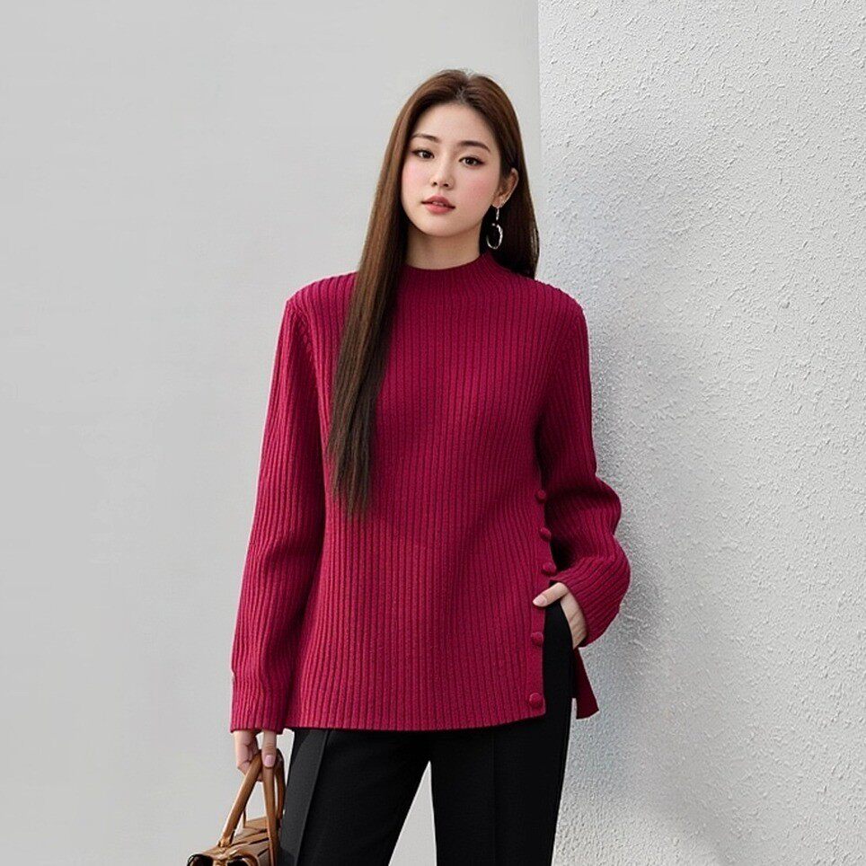 半高领毛衣女秋冬新款下摆纽扣开叉设计感炸街毛衣别致小上衣ins