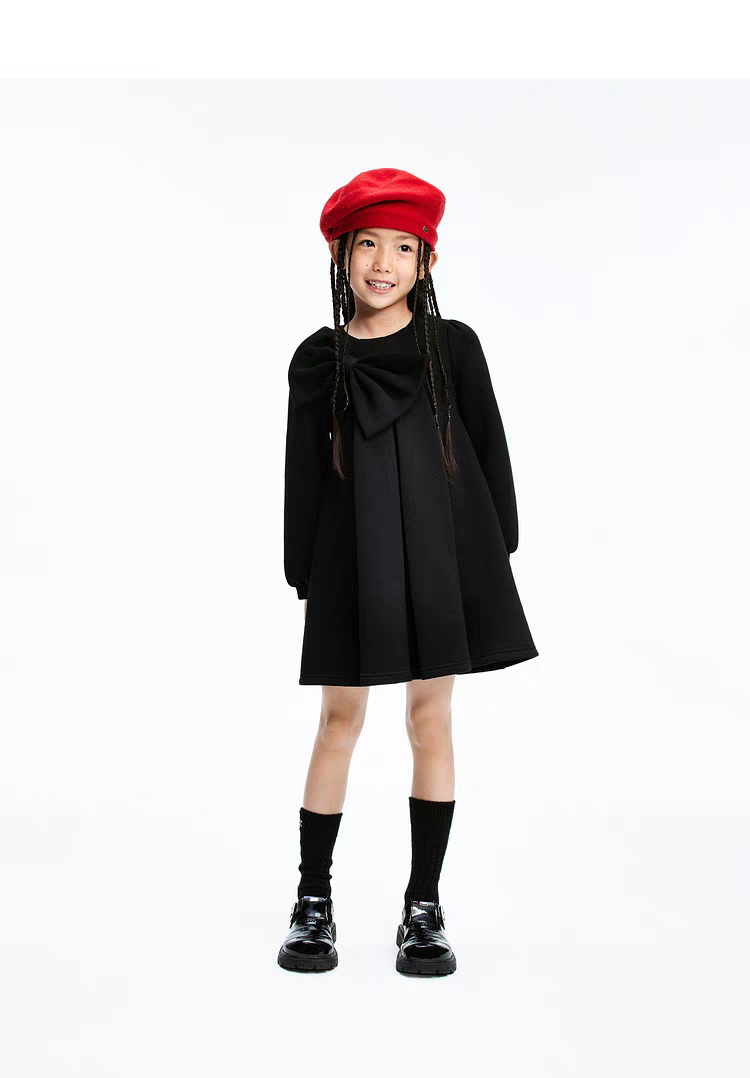 小moco童装24冬装新款女童泡泡袖A摆长袖连衣裙KBD4DRS018