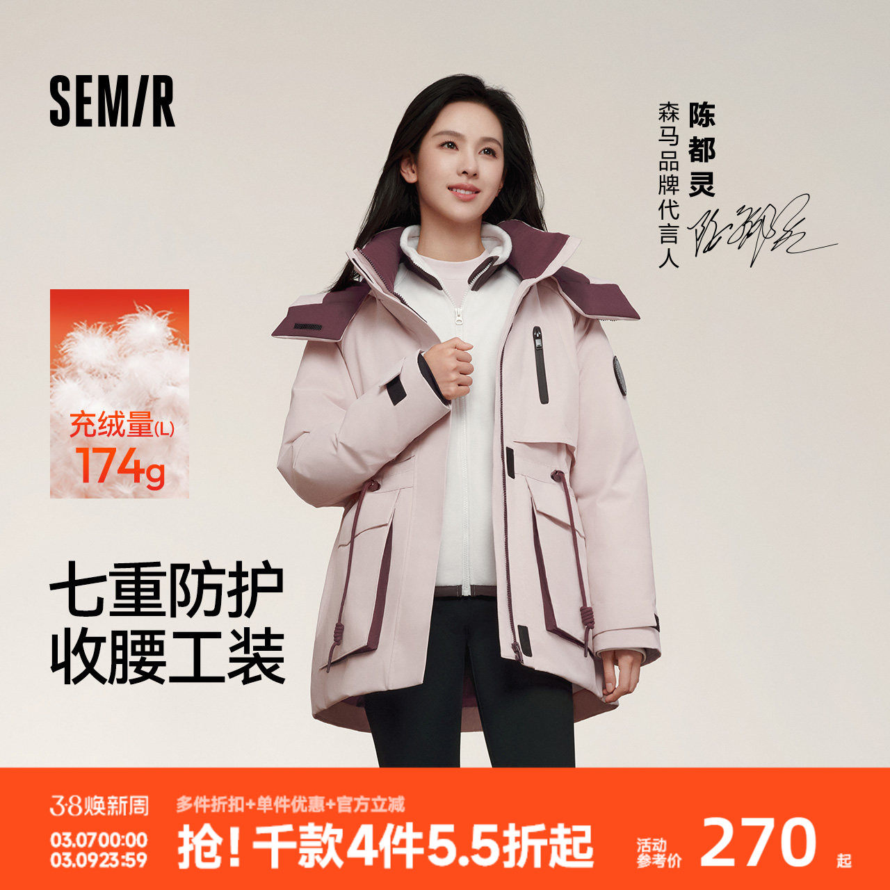 陈都灵|防护|森马羽绒服女冬中长款三防户外收腰工装风宽松厚外套