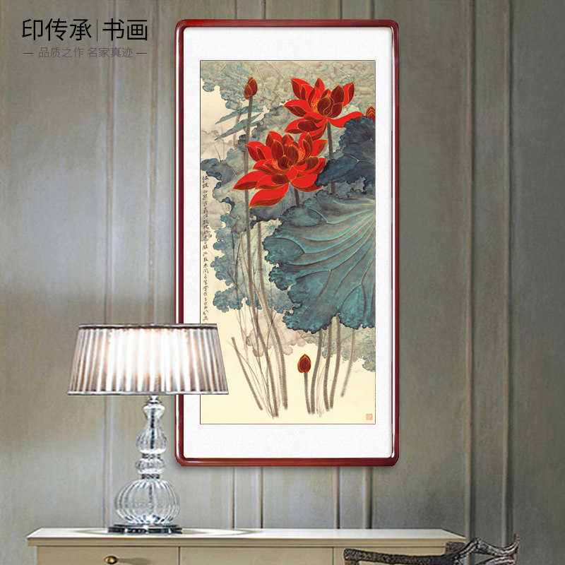 新中式客厅装饰画 带框国画荷花鸟画 名人字画书画作品 红荷花