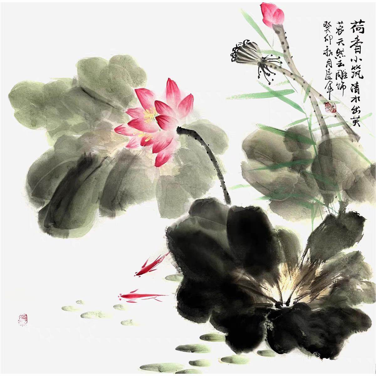 纯手绘国画荷花斗方水墨写意花鸟画横幅客厅书房办公室字画已装裱
