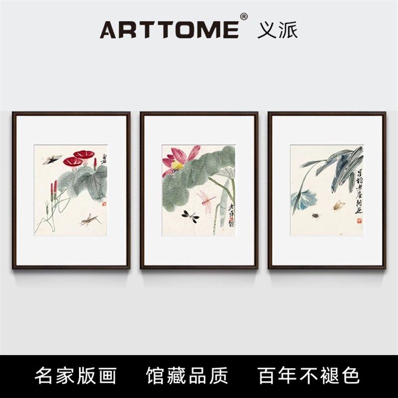 花间虫鸣 齐白石写意国画荷花蜻蜓 中式客厅餐厅卧室三联挂画版画