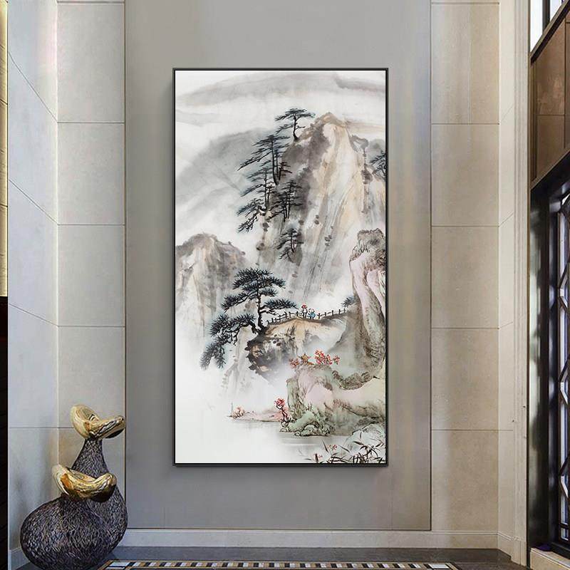 入户玄关装饰画新中式竖版国画荷花过道装饰壁画走廊尽头客厅挂画