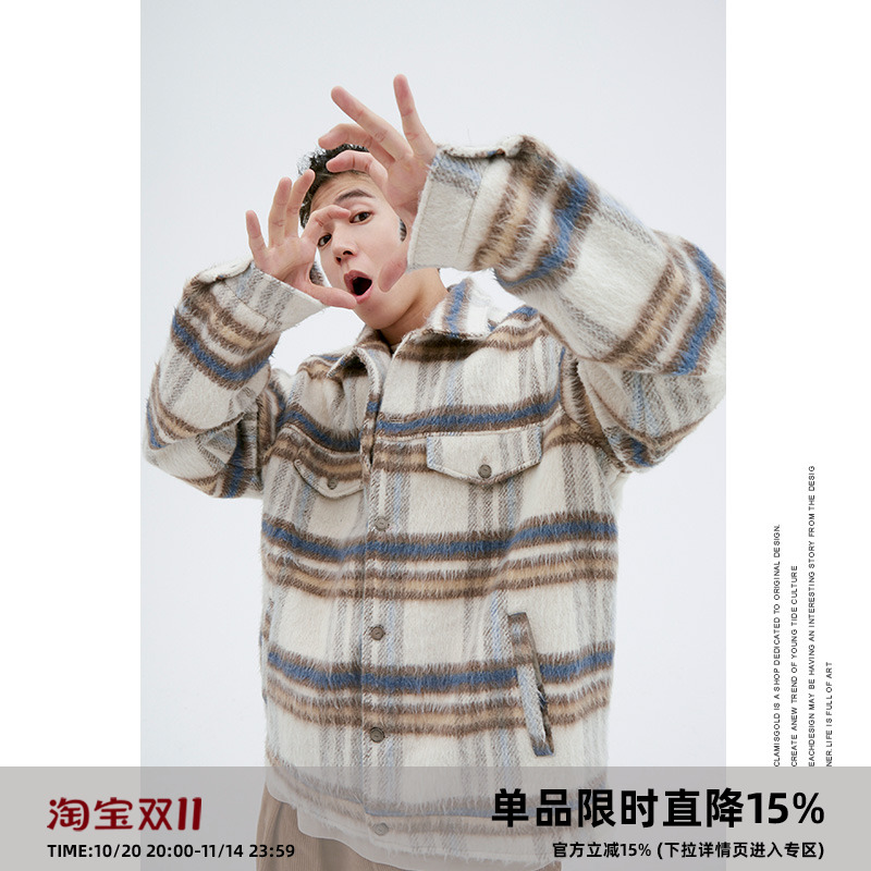 CLAMISGOLD潮牌秋冬美式宽松格子毛呢子大衣加厚棉服外套男女情侣