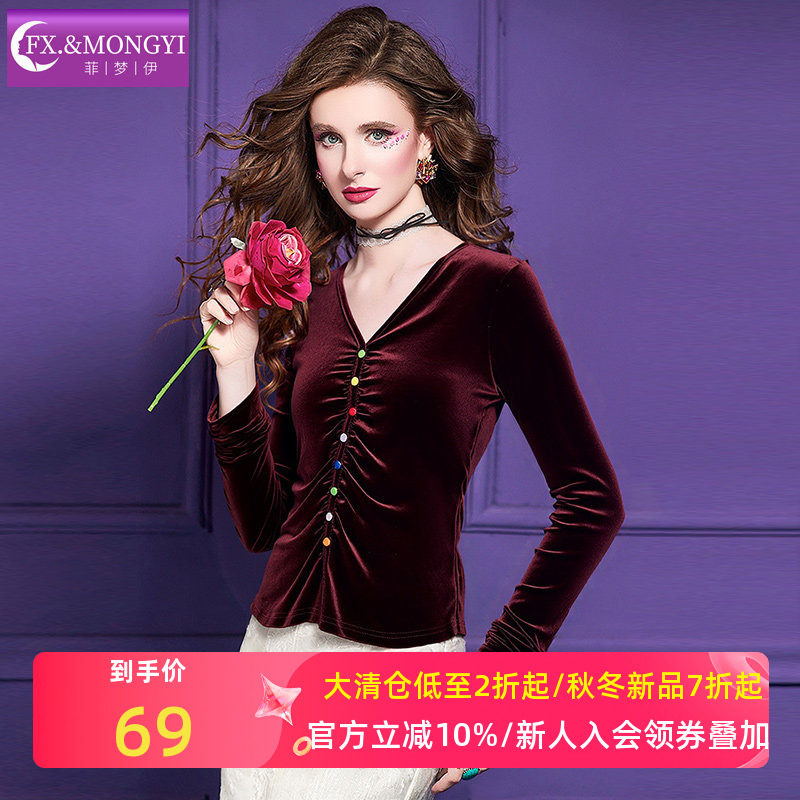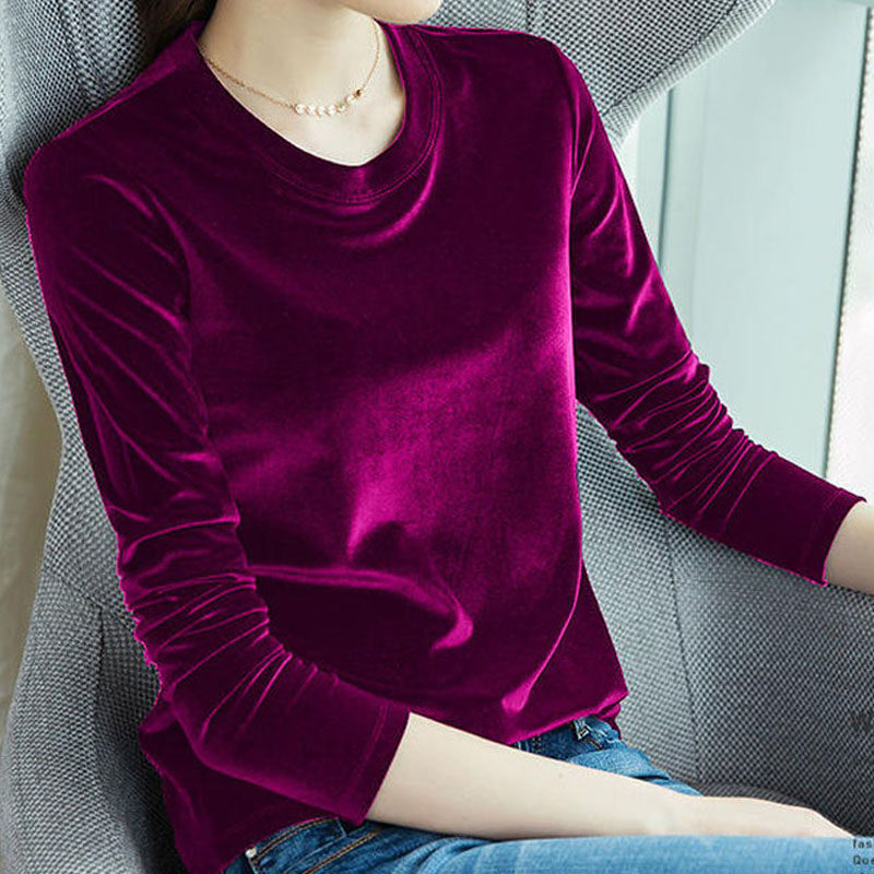 金丝绒圆领长袖T恤女欧洲站时尚洋气V领外穿上衣内搭打底衫春秋款