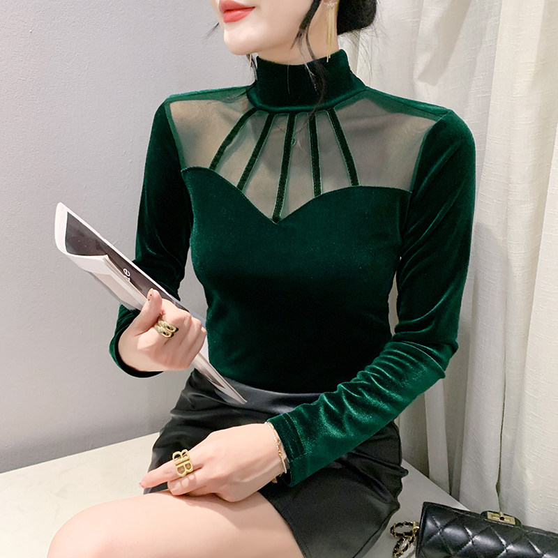 金丝绒打底衫女秋冬洋气性感透视网纱长袖T恤紧身内搭半高领上衣