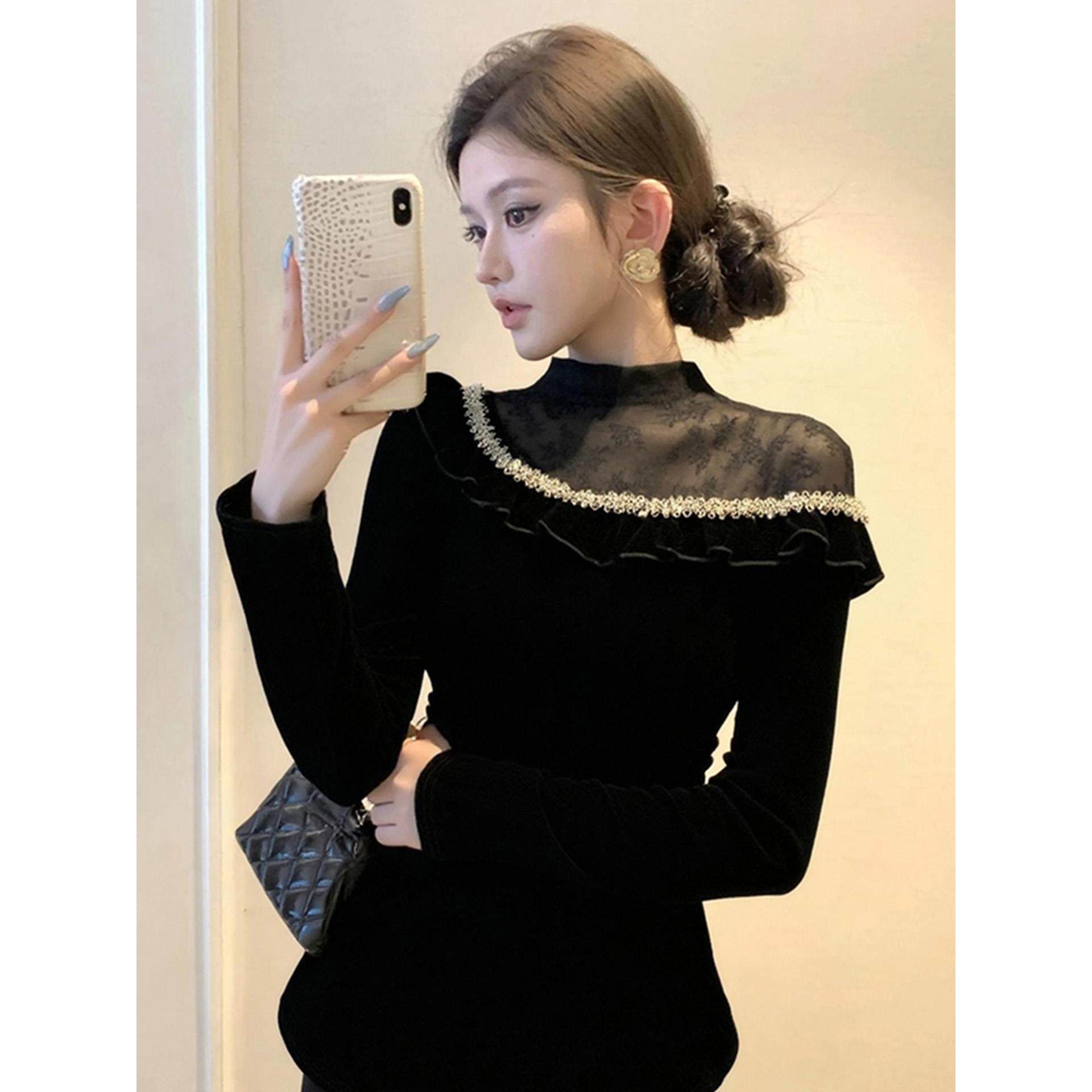丝绒上衣女秋冬2025年新款半高领蕾丝打底衫长袖T恤高端洋气小衫