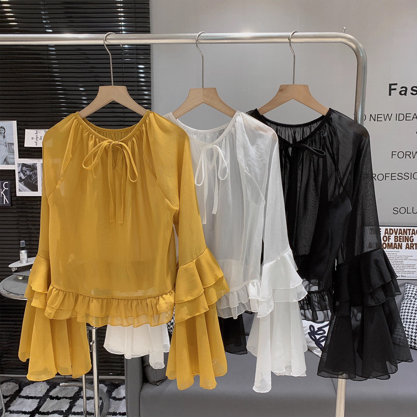 韩国chic法式小众荷叶边飘带衬衫女夏季气质喇叭袖微透雪纺衫上衣