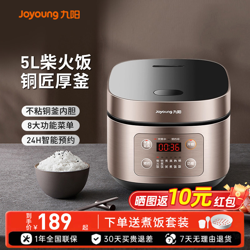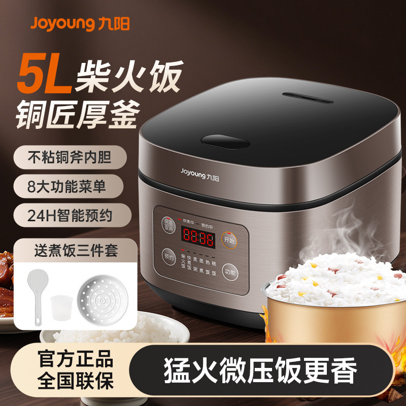 九阳电饭煲5L大容量家用多功能智能预约煮饭锅不粘铜釜一键柴火饭