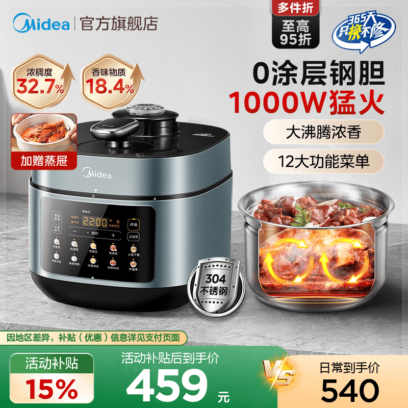 美的电压力锅家用5L大容量0涂层不锈钢双胆多功能智能饭煲高压锅