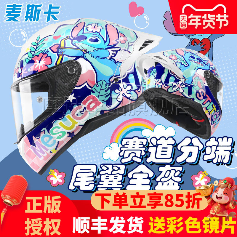 新款麦斯卡摩托车头盔全盔机车单镜片大尾翼男女死侍草莓熊库洛米