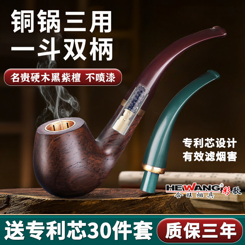 合旺实木三用烟斗手工过滤黑檀木烟丝专用男士老式旱烟袋铜锅烟斗