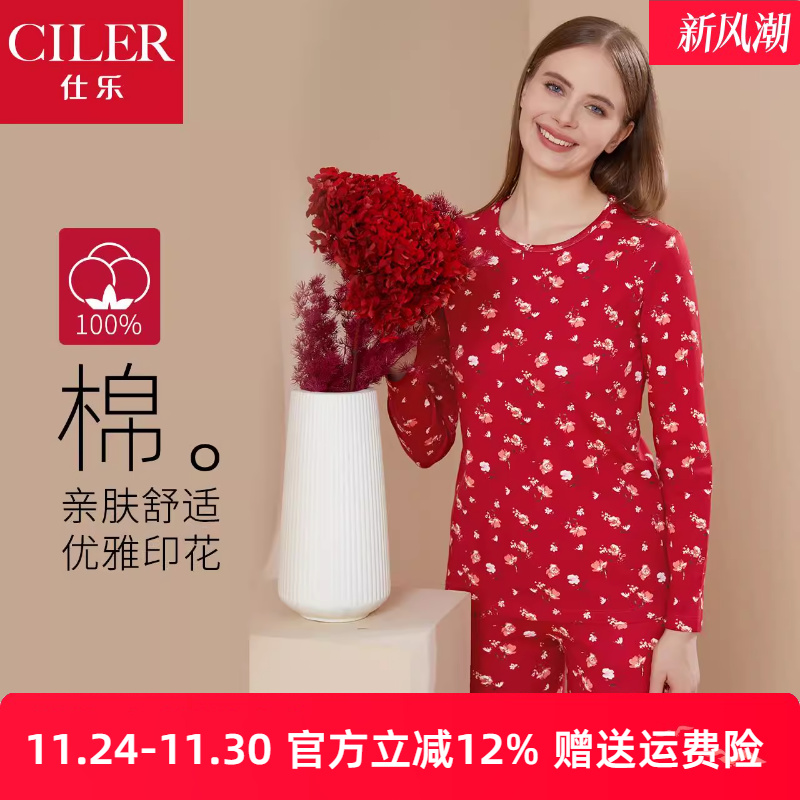 仕乐纯棉中厚印花保暖套装秋衣秋裤中年妈妈款衬衣衬裤红色本命年