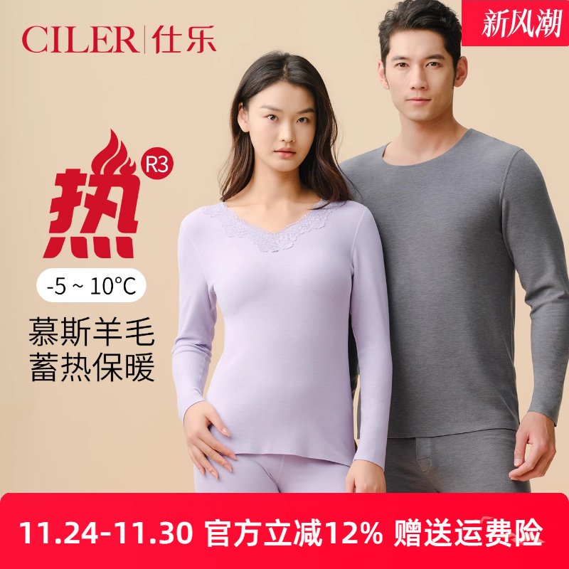 仕乐秋冬男慕斯羊毛中厚无痕保暖内衣女蕾丝发热纤维秋衣秋裤套装