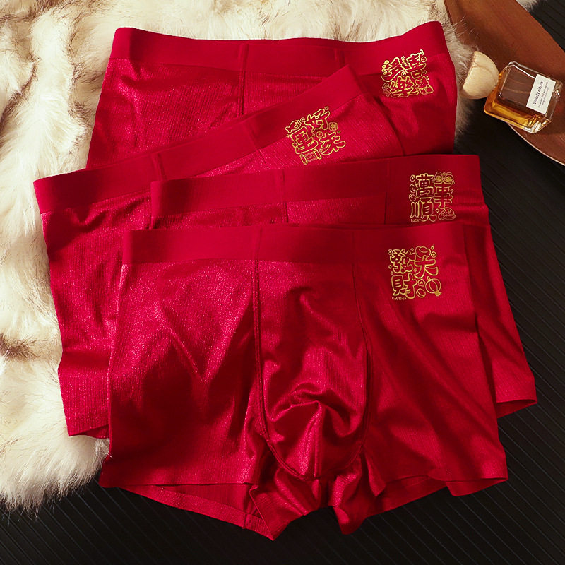 枣红色本命年男士内裤无痕蚕丝内档过年平角裤喜庆大红色男生裤衩