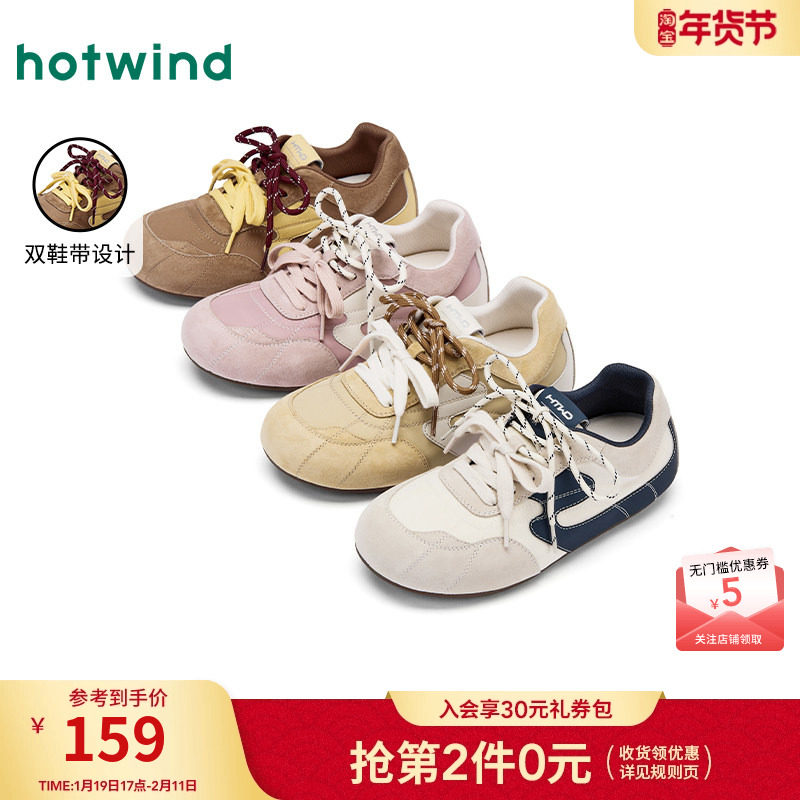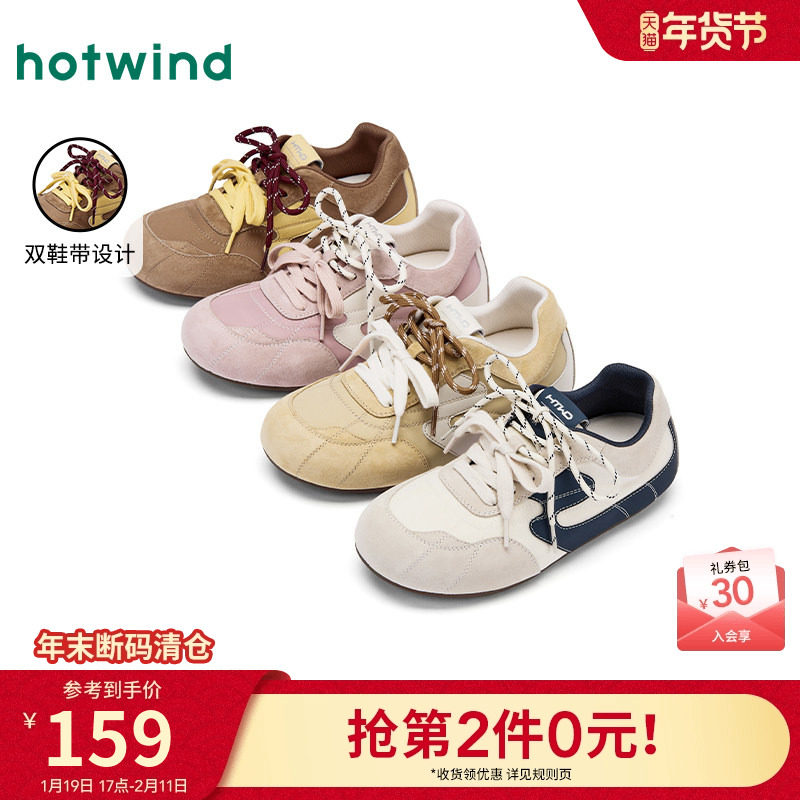 热风薄底休闲鞋女款2025年冬季新款双色鞋带百搭女鞋粉色运动鞋子