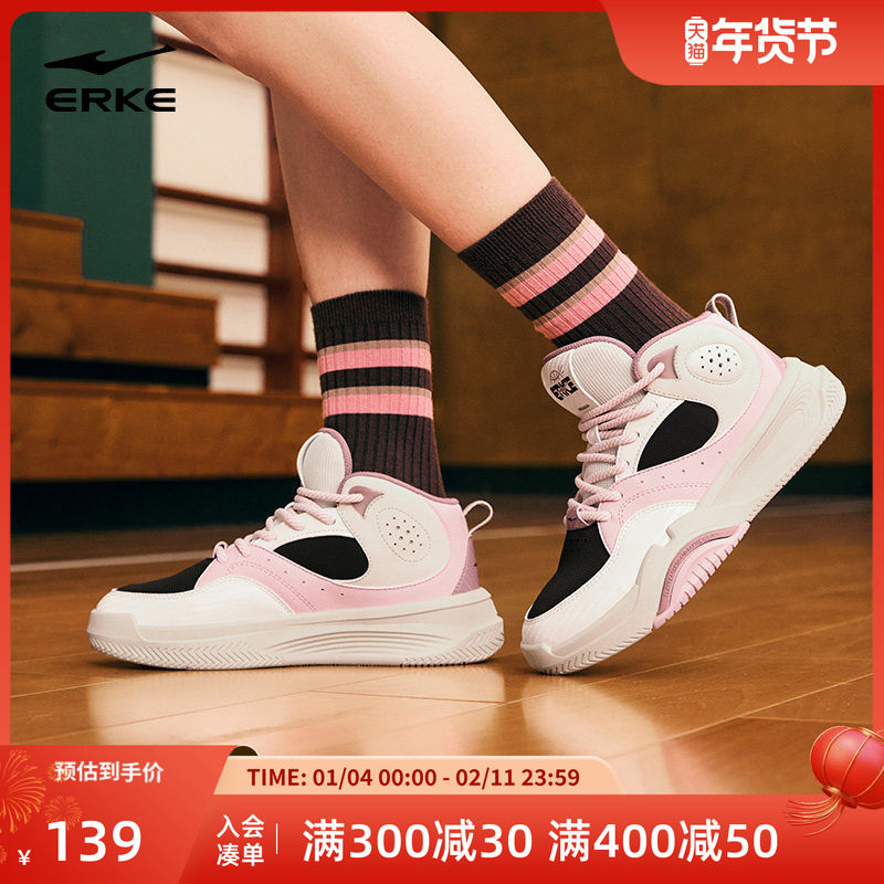 擎天鸿星尔克高帮女鞋篮球板鞋冬季新款休闲鞋革面厚底粉色运动鞋