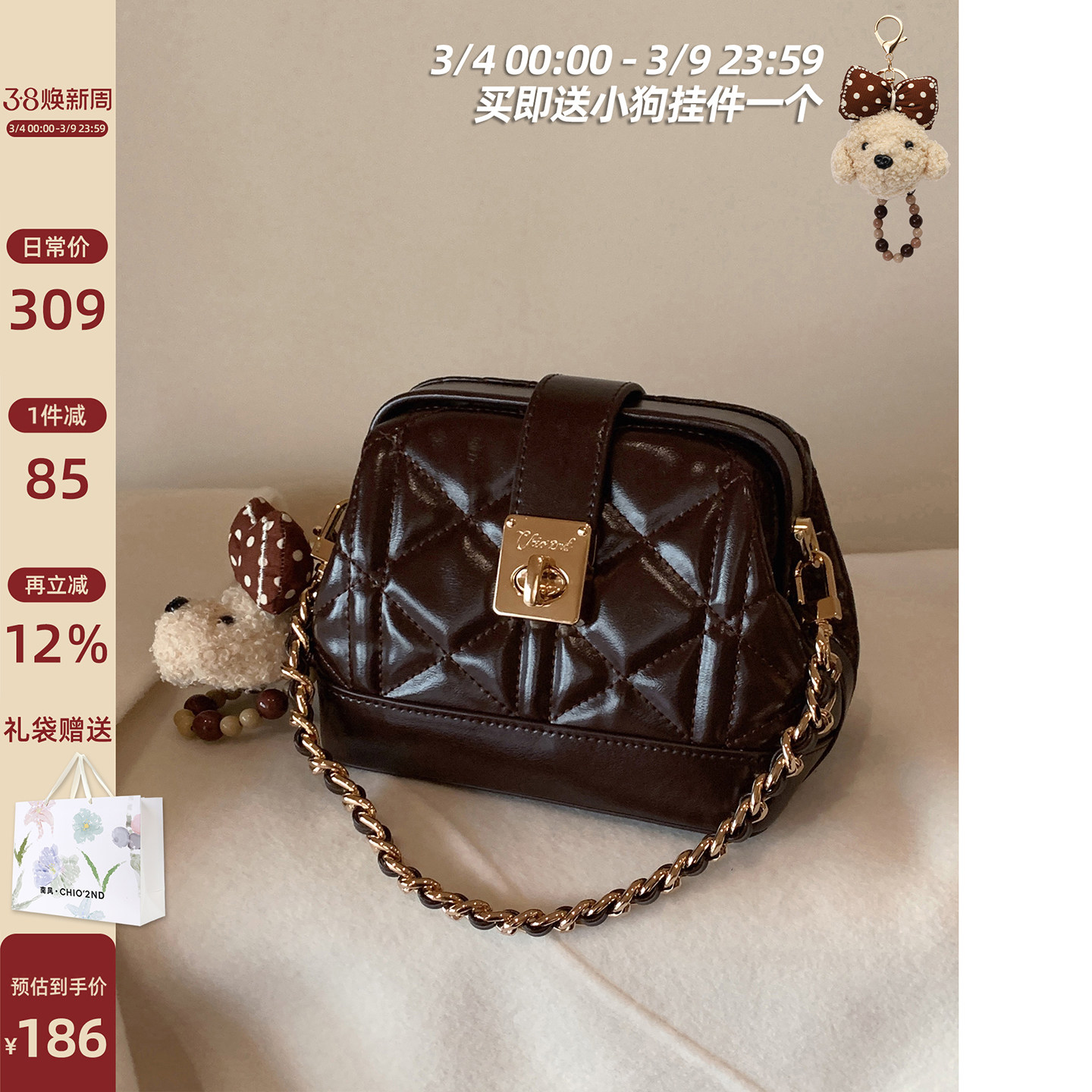 南风Chio2nd 暖冬华夫小方包包女日常通勤百搭链条菱格单肩斜挎包