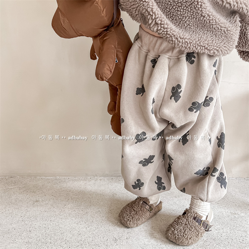 儿童韩版抓绒休闲裤卫裤秋冬款宝宝小熊印花运动裤男女童哈伦裤潮