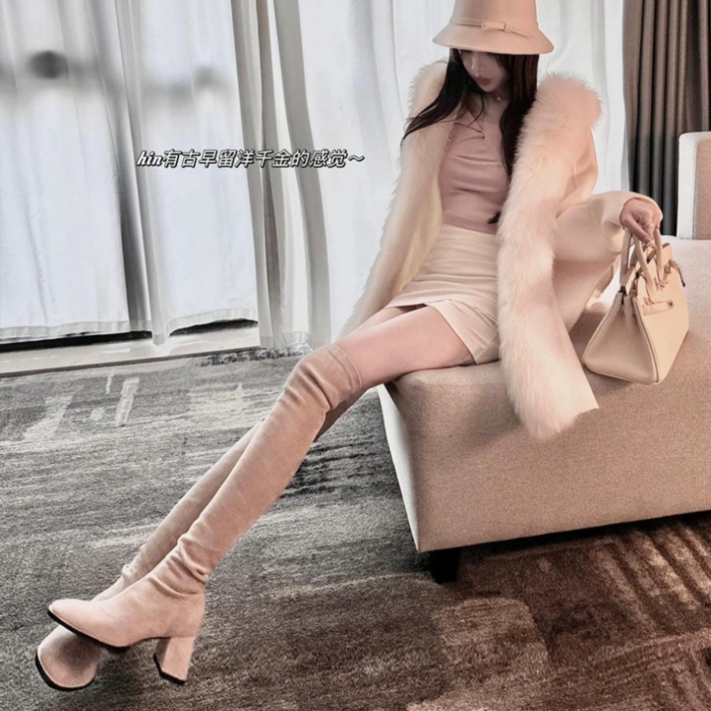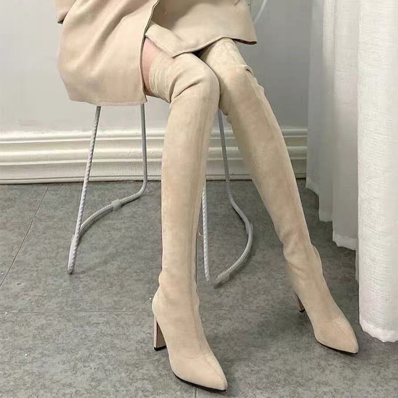 尖头高跟过膝长靴女2025年新款杏色绒面弹力瘦瘦靴粗跟显瘦高筒靴