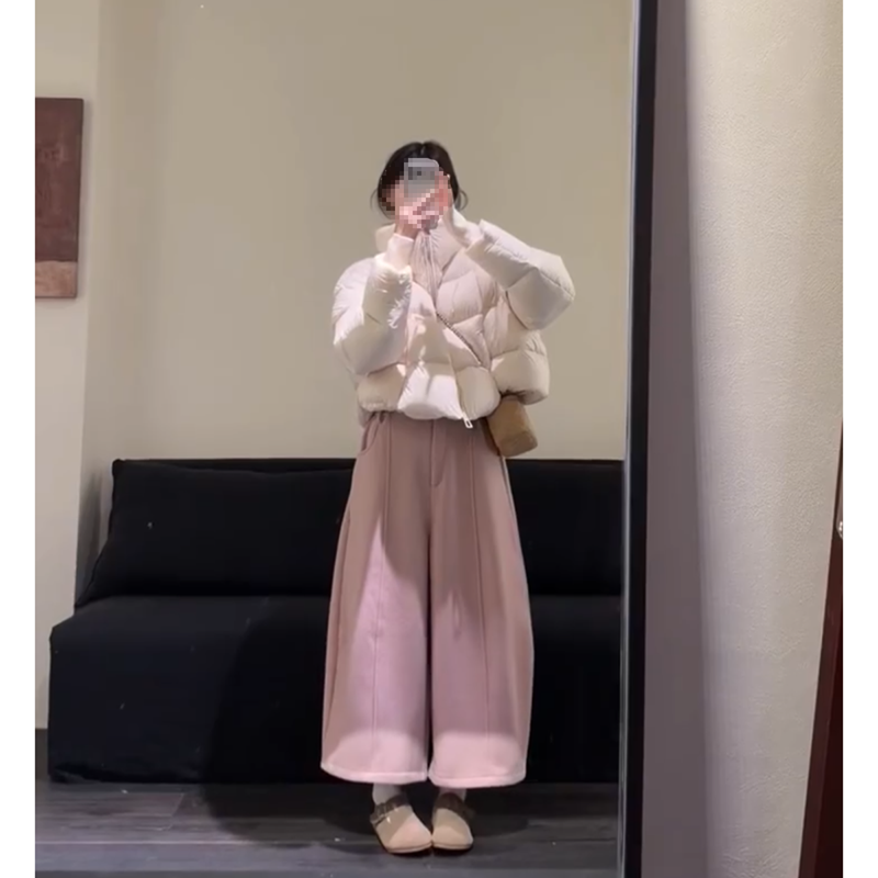 法式甜美风氛围感粉色毛呢长裤女搭配宽松保暖棉服外套两件/套装