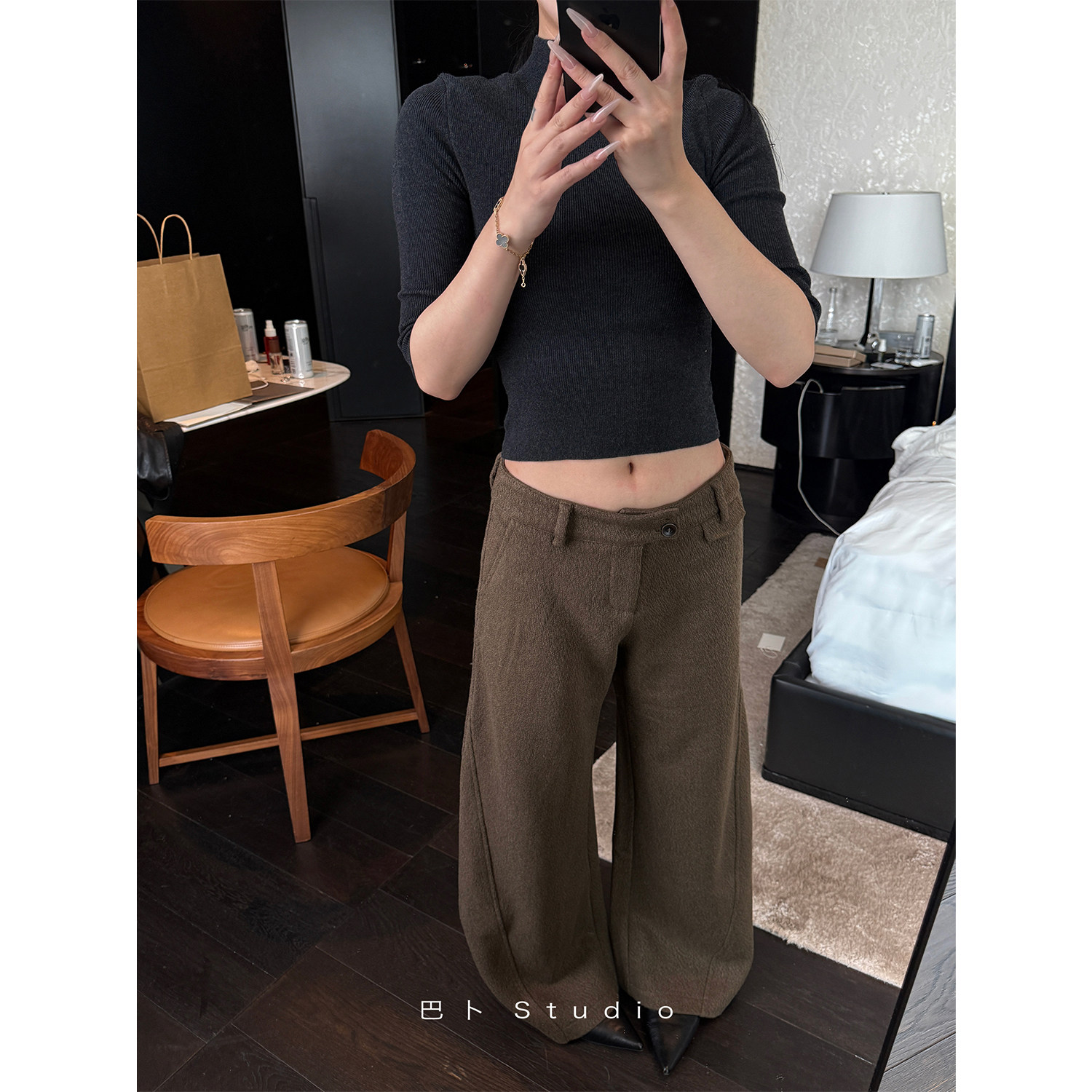 巴卜Studio 深咖色高腰毛呢长裤女秋季新款简约宽松百搭直筒裤