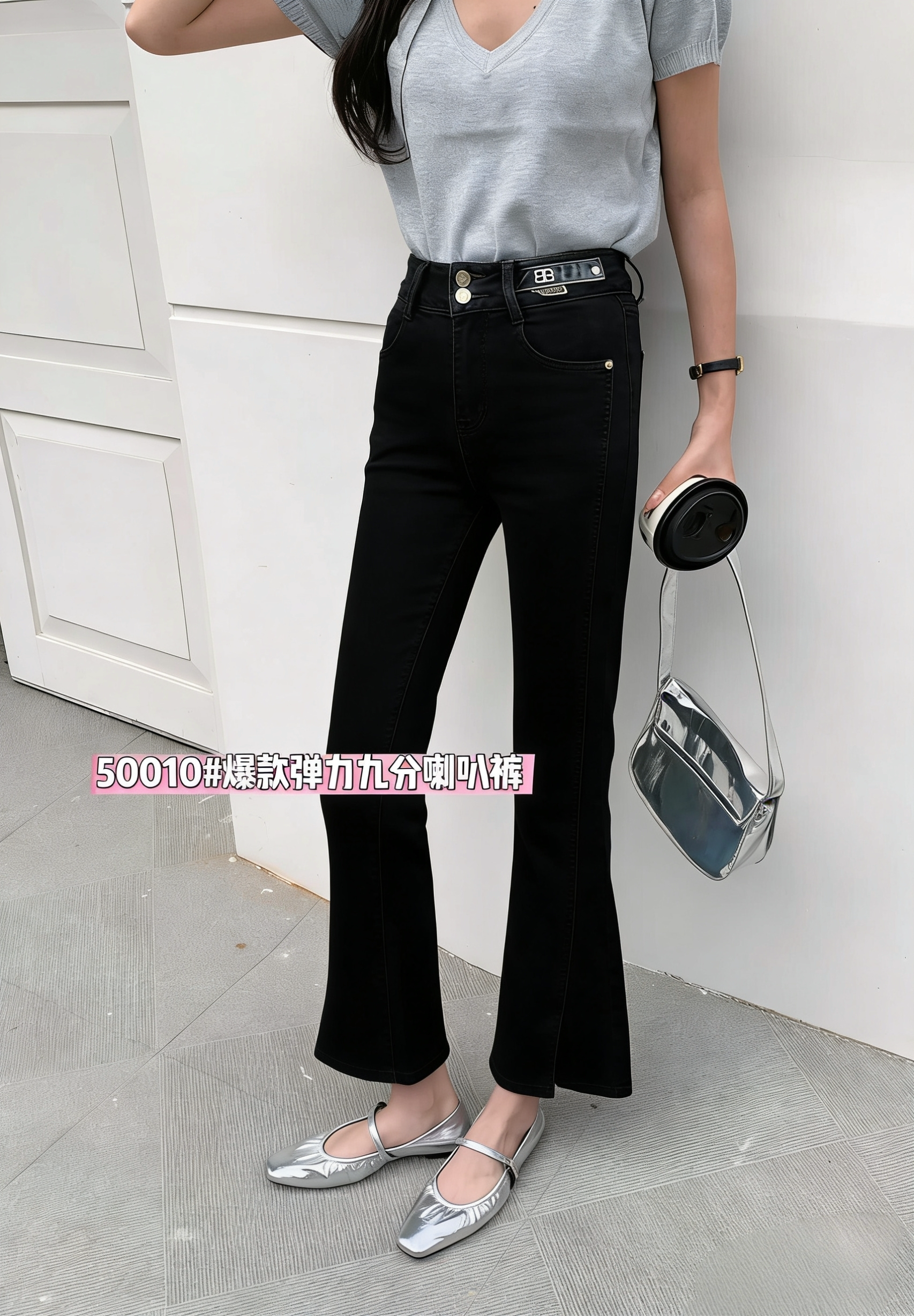 脚口开衩!巨显瘦黑色微喇九分牛仔裤女中腰弹力修身水洗喇叭裤春