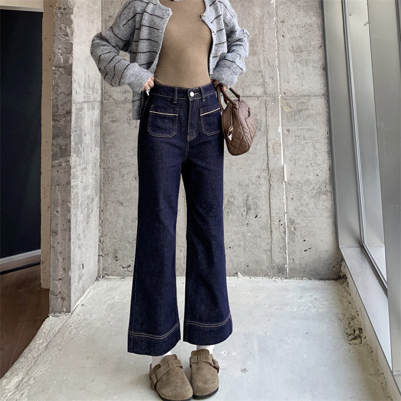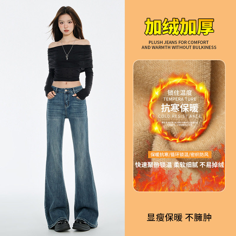 曹大曼时髦显腿直修身弹力显瘦加绒高腰复古微喇叭九分牛仔裤女冬