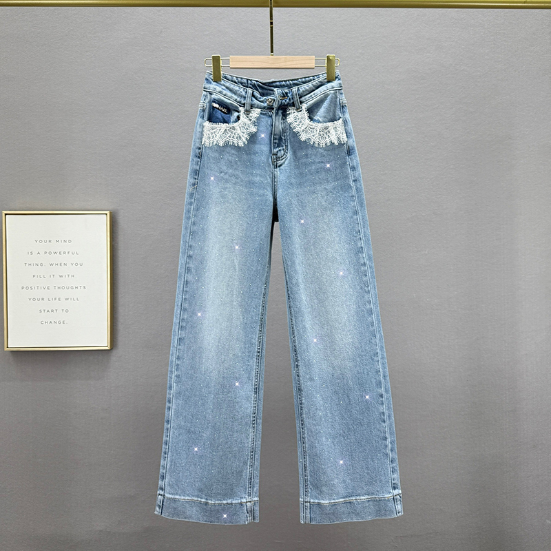 牛仔阔腿裤女2025年春季新款高腰宽松显瘦欧货烫钻蕾丝拼接加长裤