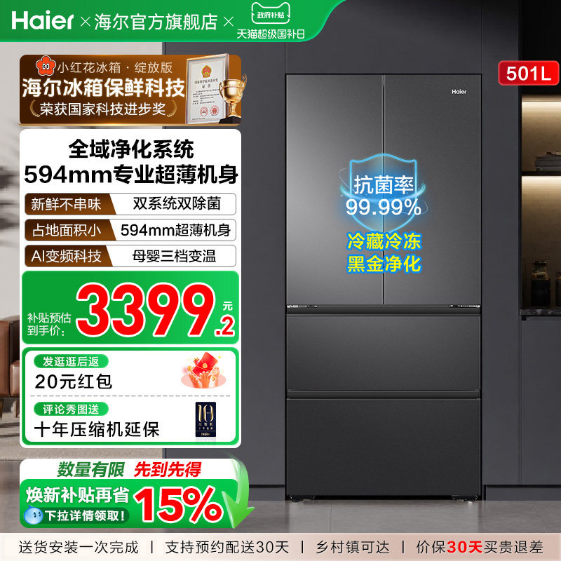 【双系统新品】海尔小红花501L法式多门风冷无霜家用节能电冰箱
